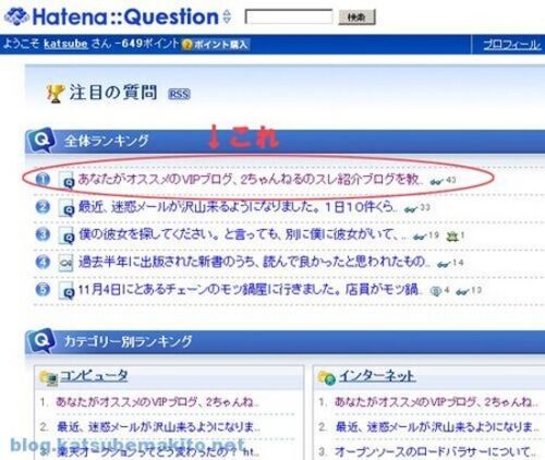 とったどー!(濱口風に) 人力検索で1位をとったけど、何だろうこの微妙な感じは(;´∀`) http://q.hatena.ne.jp/ranking http://q.hatena.ne.jp/1163470524 ※よりによってこの質問とは(笑) はてなでは黒かつべが出没してますのでご注意ください。的外れ回答…