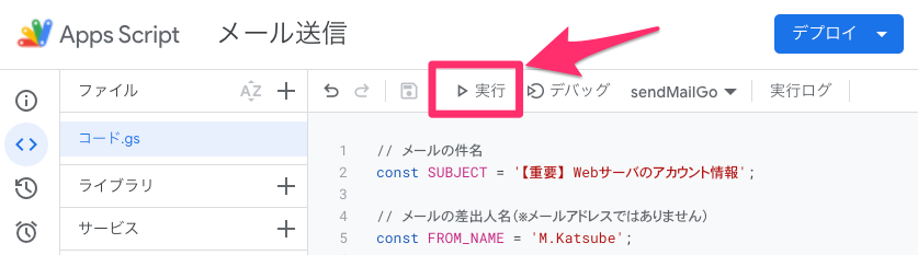 実際に送信された文面はconsole.log()で「実行ログ」に出力されるので、内容を確認することができます。